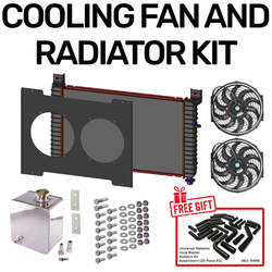 - 12V 80W 12 Inch radiator cooling fan with mount brackets and tie straps kit. Auxiliary equipment for cooling the entire engine compartment, including radiator, A/C system, intercooler, oil system, and transmission