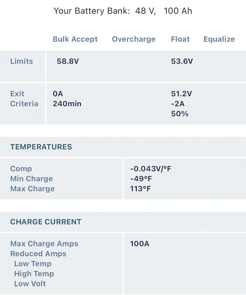 ⚠️ Customer Responsibility: Customers must be running a battery bank of at least 100Ah. It is critical that the customer confirms the generic profile matches their battery requirements. Refer to the image below and your battery manufacturer’s specification sheet before installation. Mechman will not be responsible for issues caused by a mismatch. Adjustments can be made through the Wakespeed app if required.