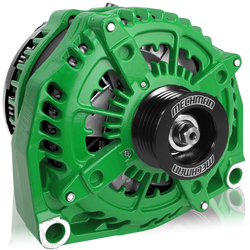 The Elite series 400 amp alternator offers great amperage output and durability at a great price. 6 phase technology, combined with massive twin rectifier assemblies and 12 huge diodes make these alternators totally durable for daily use. These impressive alternators produce 180+ at engine idle RPM and 400+ amps at cruising speeds HOT RATED. Like most high output alternators, this unit comes with a smaller diameter pulley, and will require a 1/2 inch to one inch shorter than stock length belt for proper belt tension in most applications.